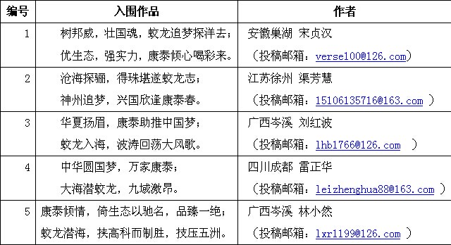 ???? 由康泰塑膠科技集團公司特邀書法家林嶠先生、楹聯(lián)家羅永嵩先生發(fā)起的“為蛟龍?zhí)柅I禮”對聯(lián)征集活動從2014年6月5日開始,至2014年6月14日截止,歷經(jīng)10天活動組委會通過企業(yè)郵箱(ktjt@ktsj.com.cn、ktsj@ktsj.com.cn)、“康泰塑膠集團”新浪官方微博、“康泰塑膠集團”官方微信訂閱號三種投稿渠道共征集到有效對聯(lián)作品373幅,現(xiàn)經(jīng)書法家林嶠先生、特邀楹聯(lián)家羅永嵩先生以及康泰集團領(lǐng)導組成的評審組依據(jù)題材切中、寓意內(nèi)涵、平仄押韻、節(jié)奏相應等標準對投稿作品進行層層篩選,本著作品充分表達“蛟龍?zhí)柤舛丝萍紝崿F(xiàn)中華強國夢;康泰生態(tài)建材實業(yè)興邦;對聯(lián)國粹彰顯愛國情懷”的重大意義與內(nèi)涵,最終產(chǎn)生5幅入圍獎作品,現(xiàn)將名單公布如下(作品排名不分先后):