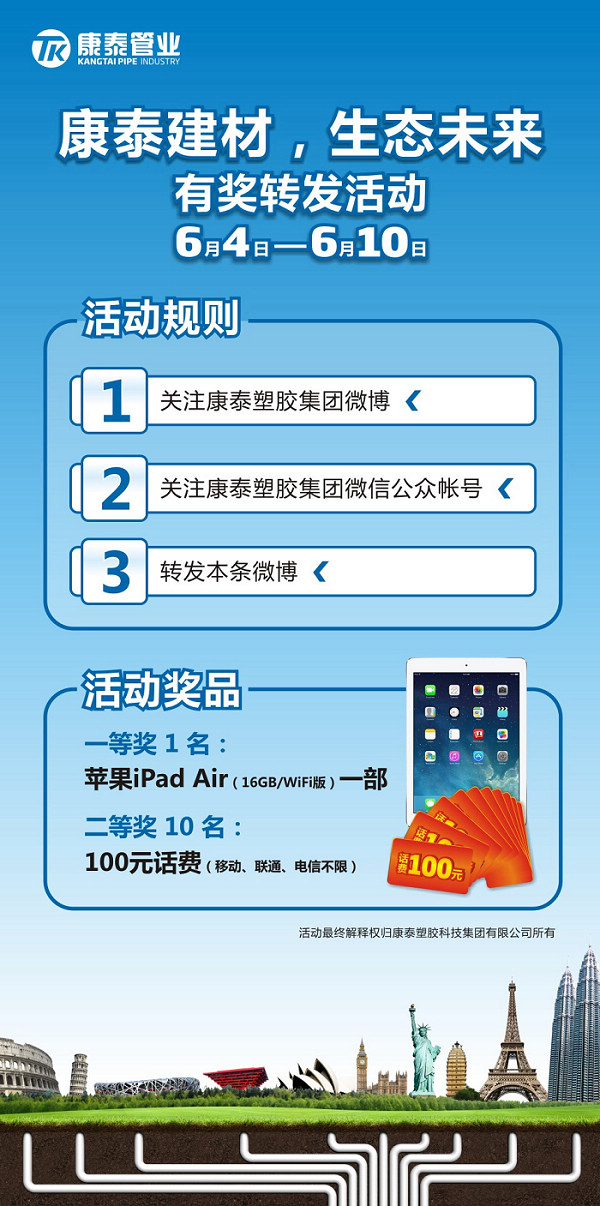 ??? 【康泰建材,生態(tài)未來】康泰管業(yè)是“生態(tài)建材”的倡導(dǎo)者,集團總資產(chǎn)達(dá)20億。只要你在6.4-6.10日期間,關(guān)注康泰塑膠集團新浪微博與微信帳號,同時轉(zhuǎn)發(fā)本微博,就有機會獲得我們送出的蘋果iPad Air(16GB/WiFi版)一部。另外,我們會有10個參與獎的名額,參與獎的獎品是100元話費。大家轉(zhuǎn)起來!