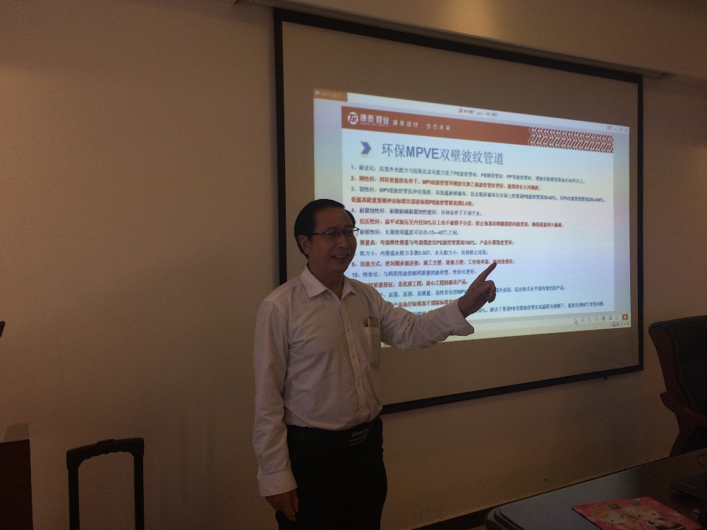 隨后,技術(shù)總監(jiān)張雙全從產(chǎn)品的原料配方、性能參數(shù)、規(guī)格型號、產(chǎn)品優(yōu)勢、配套產(chǎn)品、安裝使用、工程案例等多方面詳細(xì)介紹了MPVE?雙壁波紋管道系列產(chǎn)品并進行了現(xiàn)場技術(shù)交流。在座的領(lǐng)導(dǎo)、專家、設(shè)計師們暢所欲言,提出了許多寶貴的意見和建議,對康泰產(chǎn)品給予肯定和贊譽。